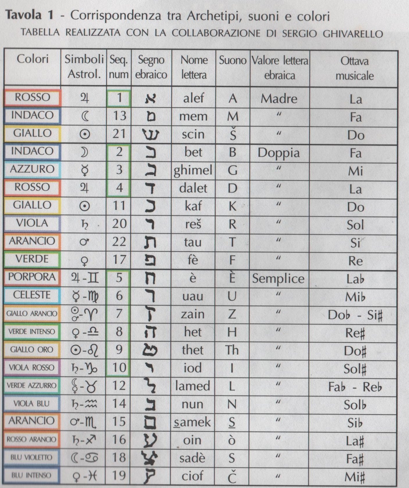 4         Scaricare le Tavole e colorale come si vuole. C’è anche l’indicazione del colore nella Tavola, ossia ogni lettera ha il suo colore, che è la sua vibrazione, così come la sua nota. Possiamo usare quel colore ma anche un altro. Ascoltarsi dentro, sempre.